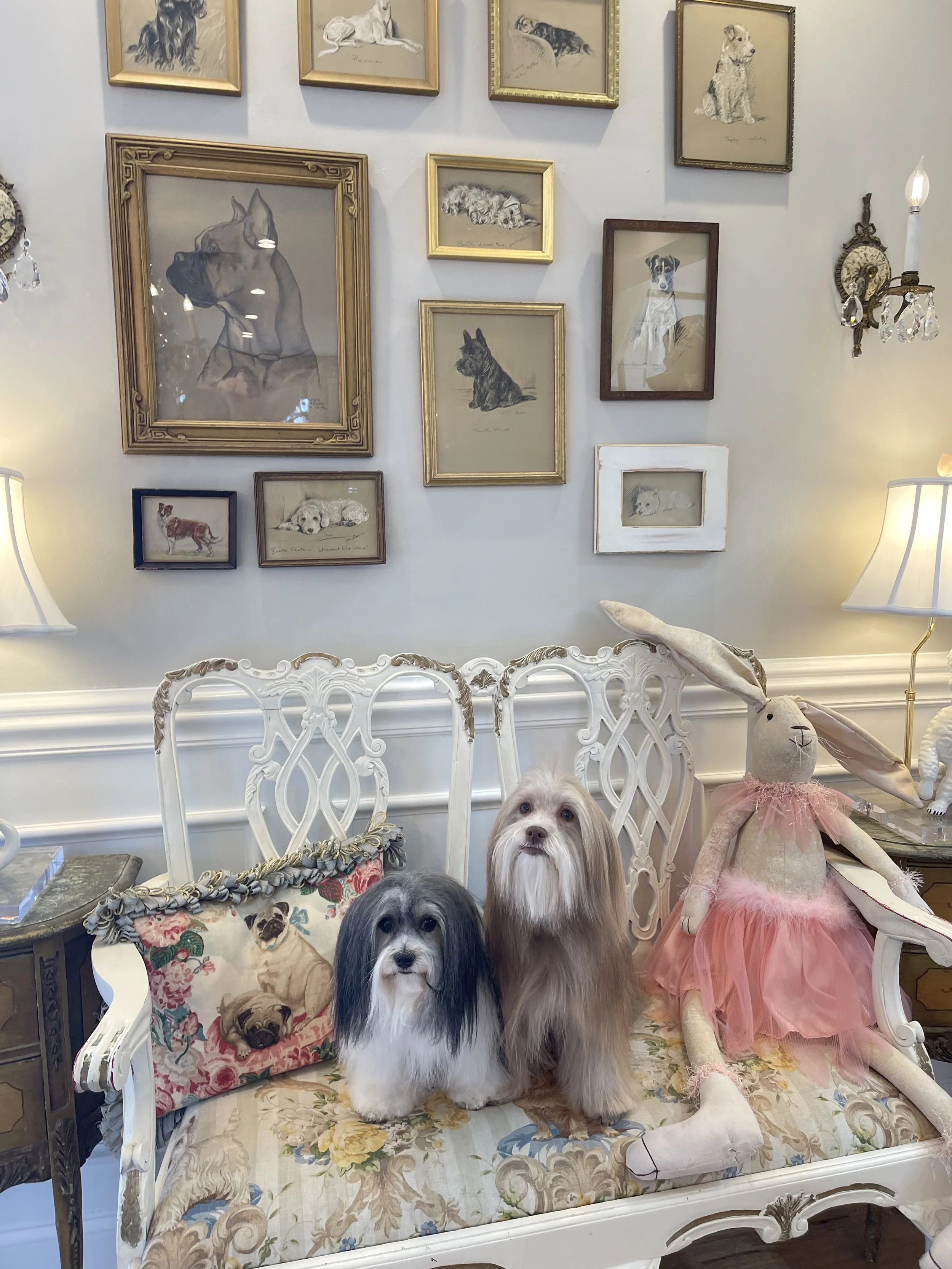A Shetland Sheepdog sitting on a vintage white settee in a living room with framed dog portraits and sculptures of poodles on side tables, under wall-mounted lamps.